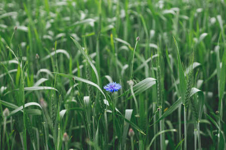 Beautiful cornflower in wheat field. Blue wildflower in green grass, selective focus. Summer in countryside, floral wallpaper. Bachelor's button, Centaurea cyanus flower.