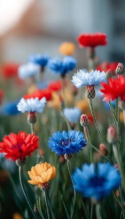Field of cornflowers in blue, purple, pink, burgundy, and white blooms