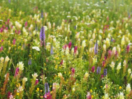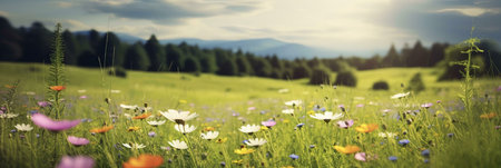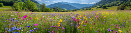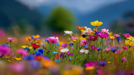 Colorful wildflowers blooming profusely across a vibrant meadow with blurred mountains in the background. Colorful wildflowers blooming in mountain meadow field
