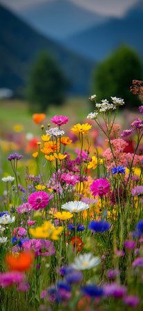 A picturesque meadow in full bloom, vibrant wildflowers against a backdrop of distant mountains and lush forest. Serene and colorful.