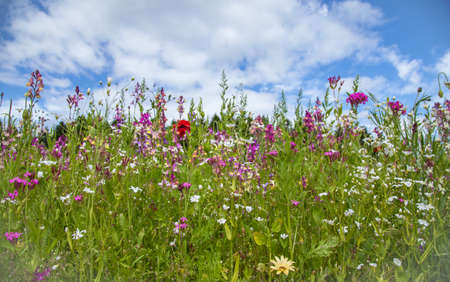 Colorful natural flower meadows landscape with blue sky in summer. Habitat for insects, wildflowers and wild herbs on a flower field. Background panorama with short depth of focus and space for text.