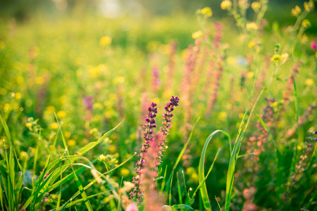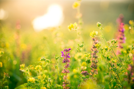 Meadow flowers and grasses illuminated by the warm sun on a summer field, an abstract bright natural background for your design.