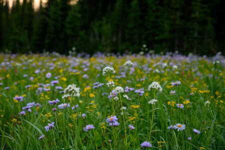 A field of colorful wildflowers in full bloom during sunset, featuring purple, yellow, and white blossoms.