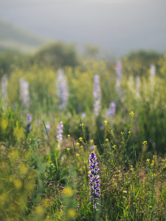 Blue wildflowers in the sunset light, shallow depth of field, beautiful landscape. landscape in nature. meadows and mountains.