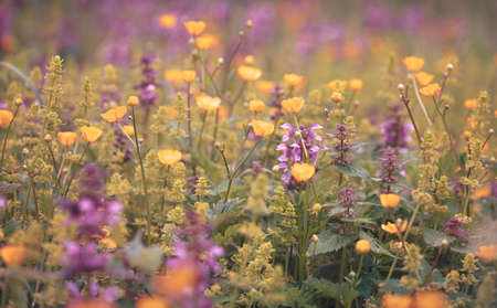 Blooming spring meadow. Field of summer flowers. Wildflowers in sunset light