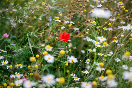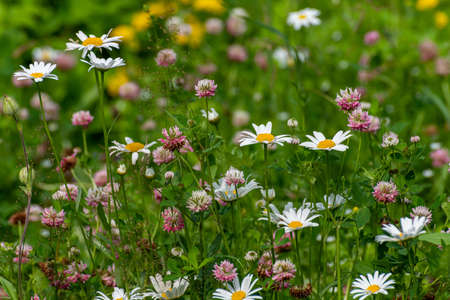Different wild meadow flowers blooming in summer. Colorful natural blossoms in field during warm season.