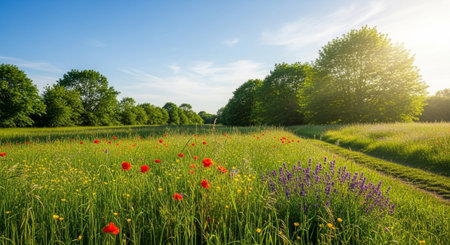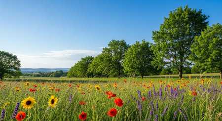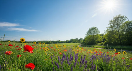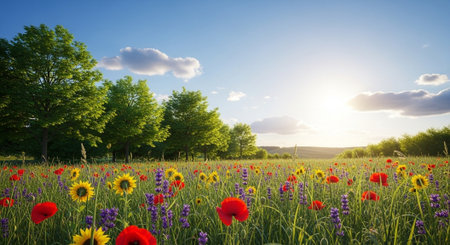 Colorful wildflowers bloom in a sunny meadow, surrounded by lush green grass and trees.