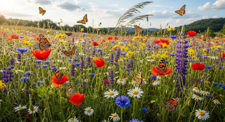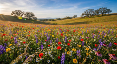 Cinematic view of rolling hills adorned with vibrant wildflowers under a clear sky