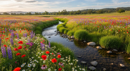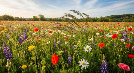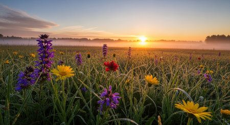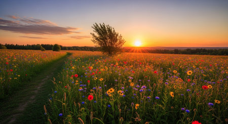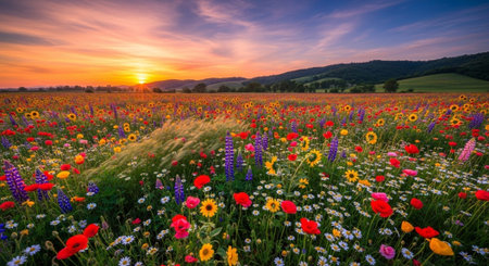 A vibrant meadow bathed in the golden light of sunset, showcasing a symphony of wildflowers and lush green grasses. The gentle sunlight creates a soft glow, illuminating the scene with a sense of tranquility and beauty.