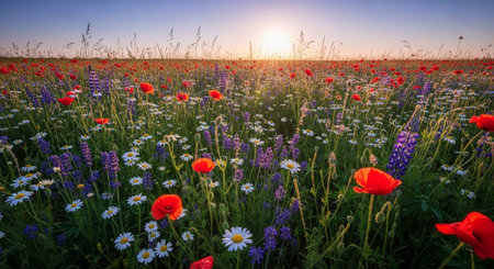 Wildflowers bathed in the warm glow of sunset. A tranquil scene of nature's beauty.