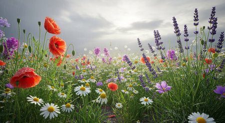 summer meadow with red poppies Field of wild of different colored species red purple yellow growing outdoors in a natural environment under the open sky