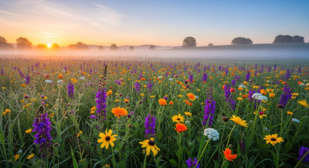 The beautiful natural landscape of summer flowers on the meadow at dawn