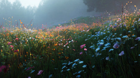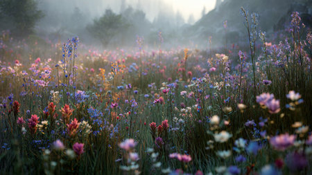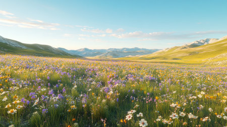 Bright wildflowers blanket a serene meadow under warm sunlight, framed by towering peaks and a gentle, misty sky, capturing tranquil summer harmony.