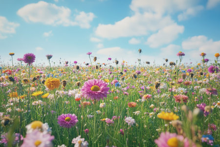 A vibrant field filled with various wildflowers during spring, buzzing with bees and illuminated by sunlight.