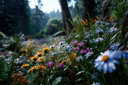 Colorful wildflowers thrive in a lush forest, illuminated by warm afternoon sunlight filtering through trees.