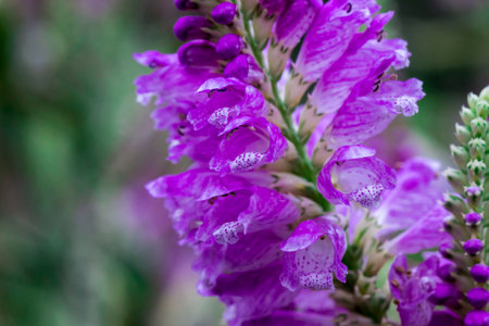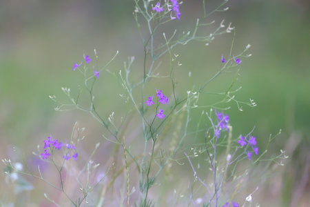 Branch of Consolida regalis, known as forking larkspur with bright purple flowers, close-up shot against a blurred green background