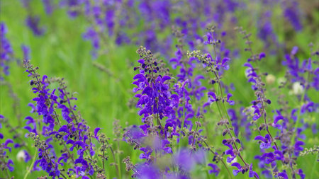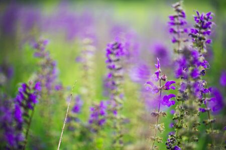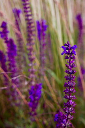 Purple flowering Sage (Salvia nemorosa) in the field, close up and selective focus