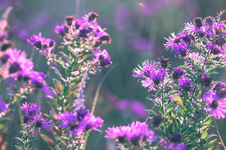 Autumn wild astra purple flowers on a meadow
