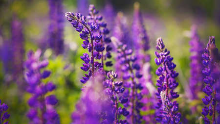 Beautiful lush fragrant purple lupine flowers grow in a field with green grass, illuminated by warm sunlight on a summer day. Field of wild grass.