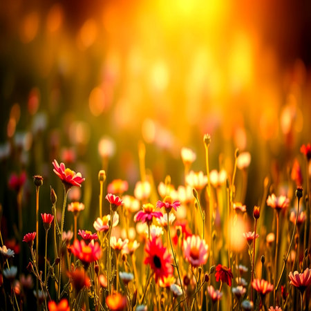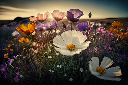 Wildflowers bathed in the warm glow of sunset. A tranquil scene of nature's beauty.