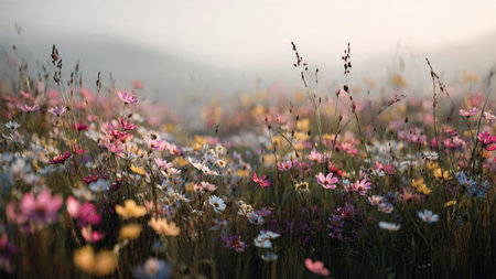 Bright wildflowers blanket a serene meadow under warm sunlight, framed by towering peaks and a gentle, misty sky, capturing tranquil summer harmony.