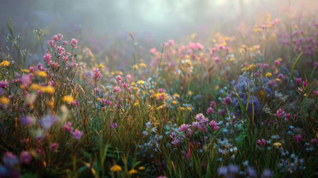 Meadow with colorful wildflowers in the morning fog.