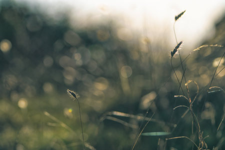 Close-up of grass flower in a meadow sparkle by the rising sun. Backlit sun