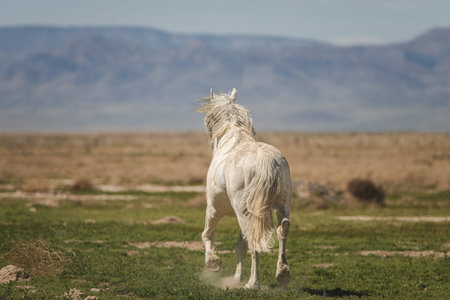 A white mustang running into the dusty, dry desert in Utah, USA
