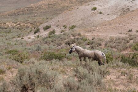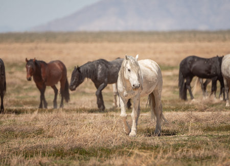 A white or grey mustang with its herd in the desert in Utah, USA