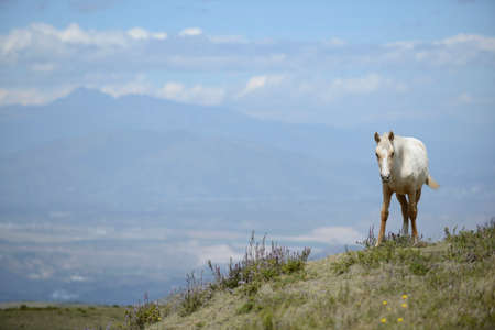 White horse in the mountains.