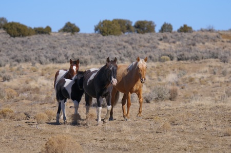A group of four wild mustangs standing together in the Colorado high desert.