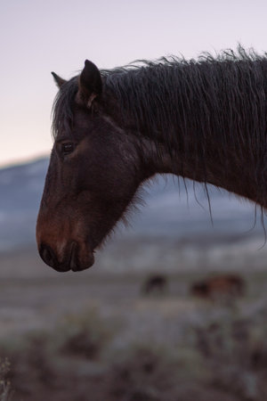 head and mane of dark brown ranch horse in Wyoming mountains
