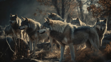 adult wolf she wolf and their playful cubs gather shadowy forest embodying bond family as they navigate mysterious wilderness together.