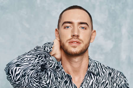handsome man wearing red leather jacket portrait. Futuristic cyberpunk fashion style. Studio light shot on white background