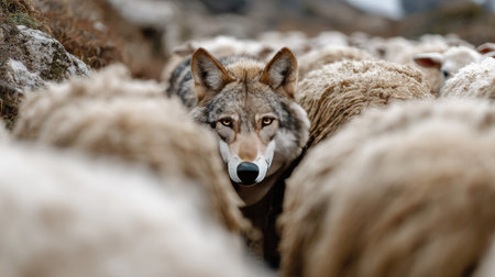 A striking image captures the intense gaze of a wolf amidst a flock of sheep, highlighting nature's predator-prey dynamics in a pastoral landscape.