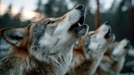 A breathtaking scene capturing majestic wolves howling in unison during twilight. This image highlights their raw beauty and connection with nature.