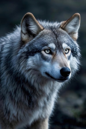 An AI generated illustration of A majestic gray wolf stands in a wooded area, gazing up towards the sky