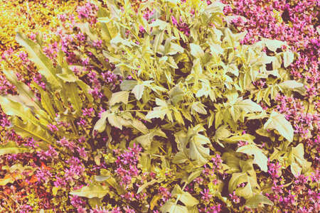 Low angle view into the flower field with creeping thistle in foreground during late summer. Beauty in nature.