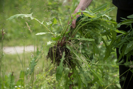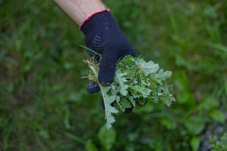 Gardener in gloves pulling fresh weeds by hand in a garden. Concept of manual weed removal, organic gardening, and outdoor maintenance on a summer day