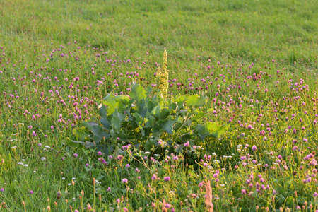 Wild horseradish gliding among the clover in the light of the setting sun.