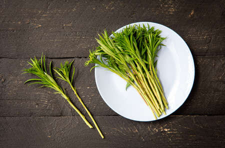 Flat lay of green willowherb or known as fireweed Chamaenerion angustifolium young fresh shroots in spring in home kitchen preparations for making food with them. Copy space.