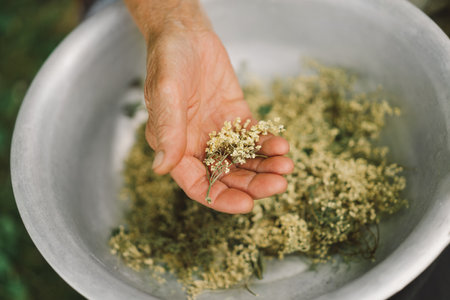 Grandmother holds in hands clusters of dried flowers black elderberry