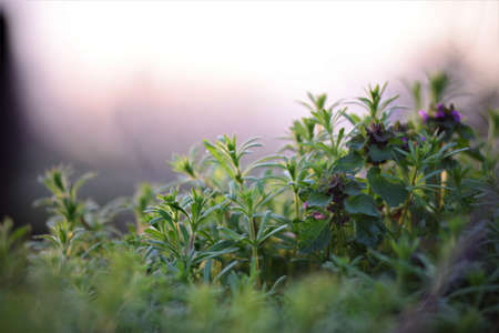 Galiume aparine and deaf nettle in backlight at sunset