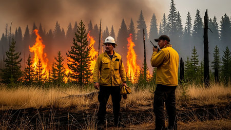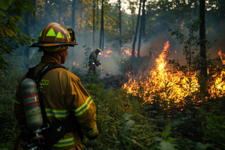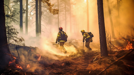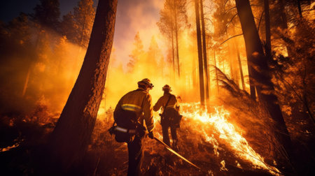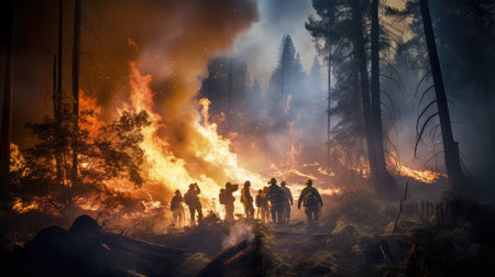 Firefighters navigating through a forest fire, working tirelessly to prevent its spread, showcasing their crucial role in battling natural disasters.
