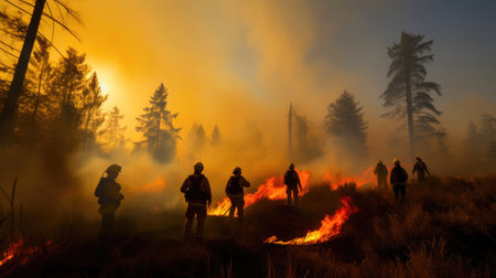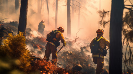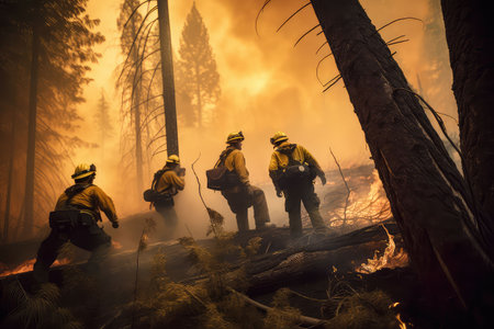 An AI generated illustration of Four firefighters uniforms are standing in a forest fire