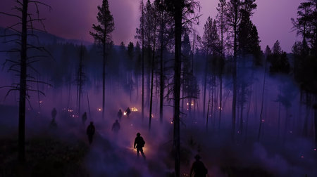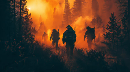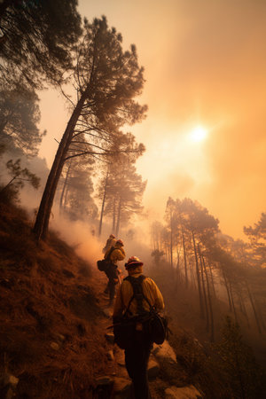 Firefighters hike up steep terrain amidst dense orange smoke and pine trees during wildfire. Dramatic scene illustrating bravery and disaster response efforts.