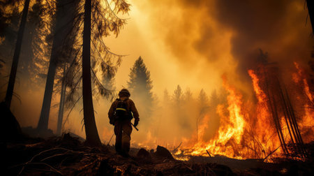 A lone firefighter confronts a wildfire, with the sun obscured by smoke, as he marches through the burning field, a symbol of the fight against nature's fury. A.I.