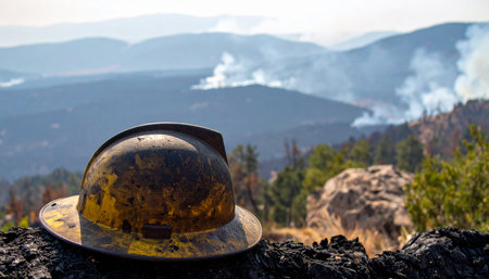 A lone, scorched firefighters helmet rests on the charred earth, a somber tribute to the bravery and sacrifice made in the face of a devastating wildfire. In the background, smoke continues to rise from the mountain landscape, a stark reminder of the ongoing battle and the immense power of nature.