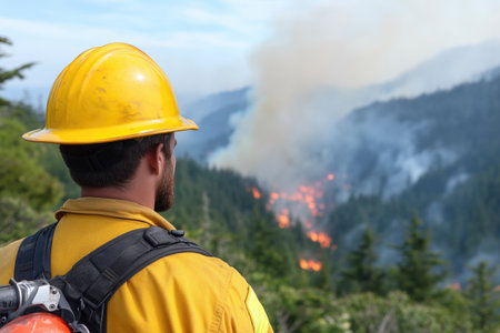 Firefighter in protective clothing and helmet looking at burning forest in mountains
