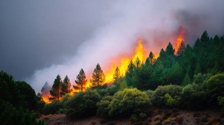 A fierce blaze engulfs lush woodland on rugged hills, with billowing smoke blending into an overcast sky, capturing urgency and nature's fury.